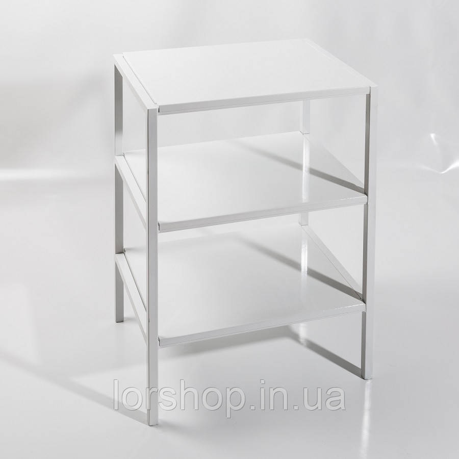 Столик медичний складається з металевого каркаса з полімерним покриттям і розташованих на ній трьох металевих полиць.